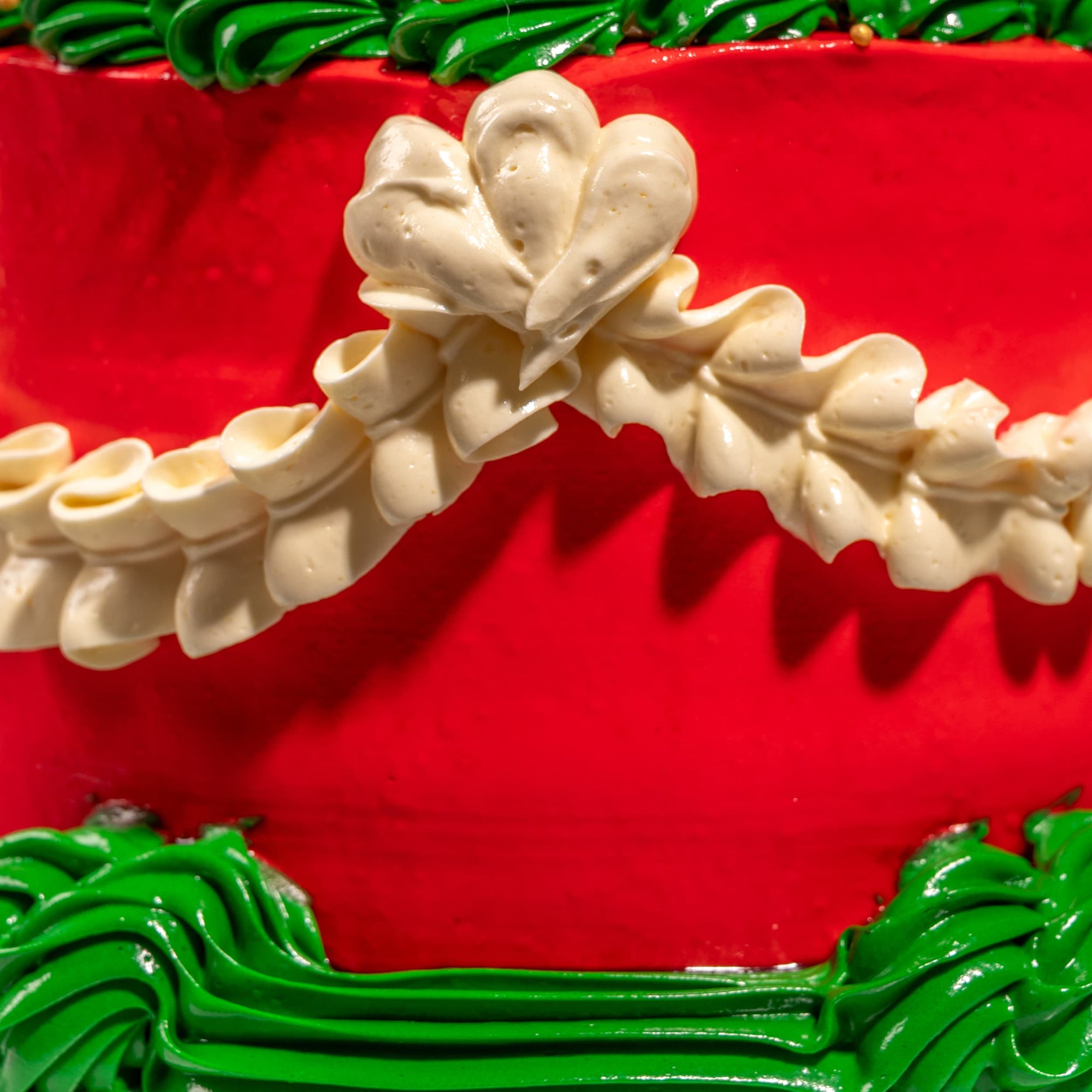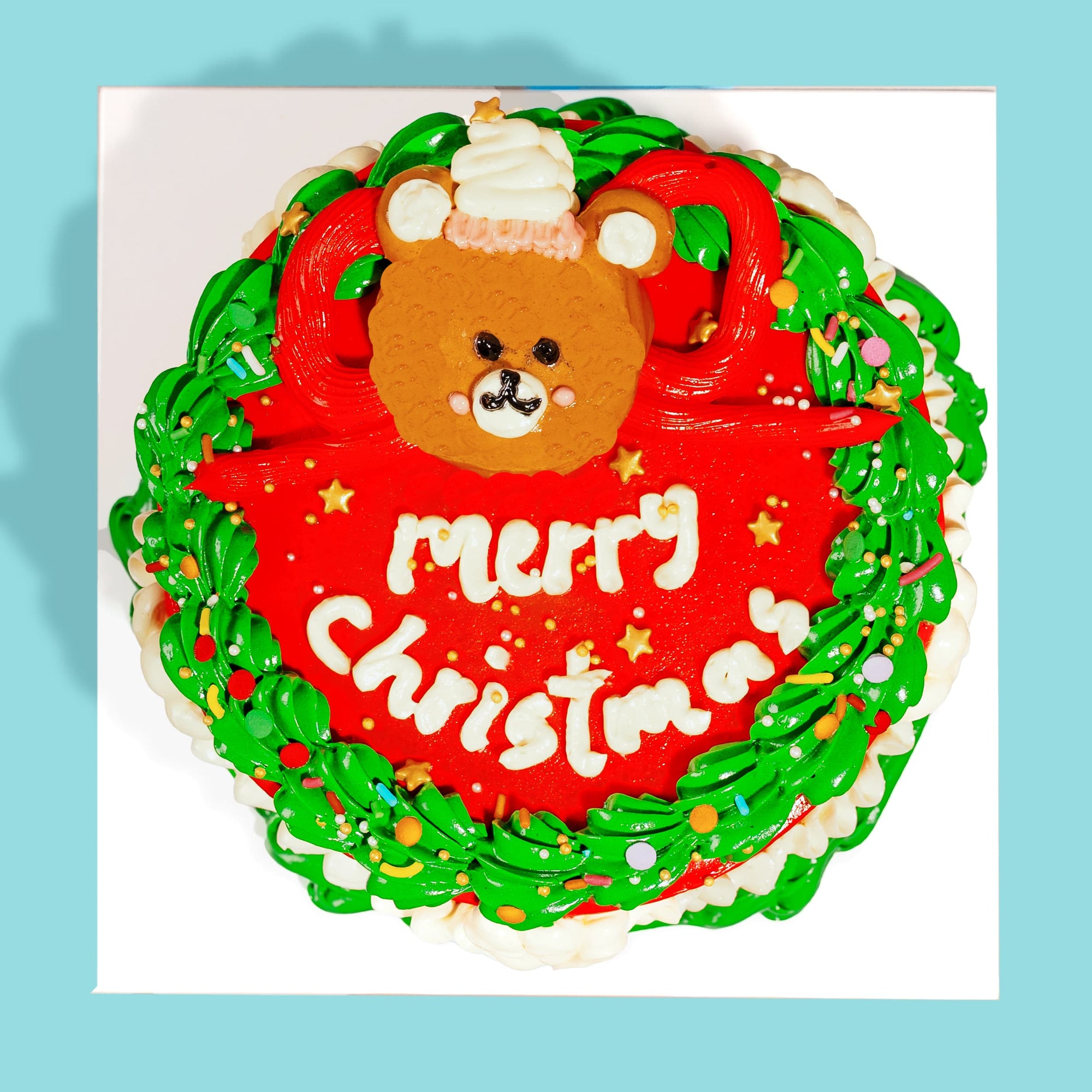 Adorably retro with all the festive feels! Choose from six delicious flavours—Classic Vanilla, Double Chocolate, Chocolate Chips, Oreo Cookies & Cream, Almond Coffee, or Earl Grey. Decorated with classic Victorian piping in bright red and green, topped with an adorable bear and "Merry Christmas" wording.