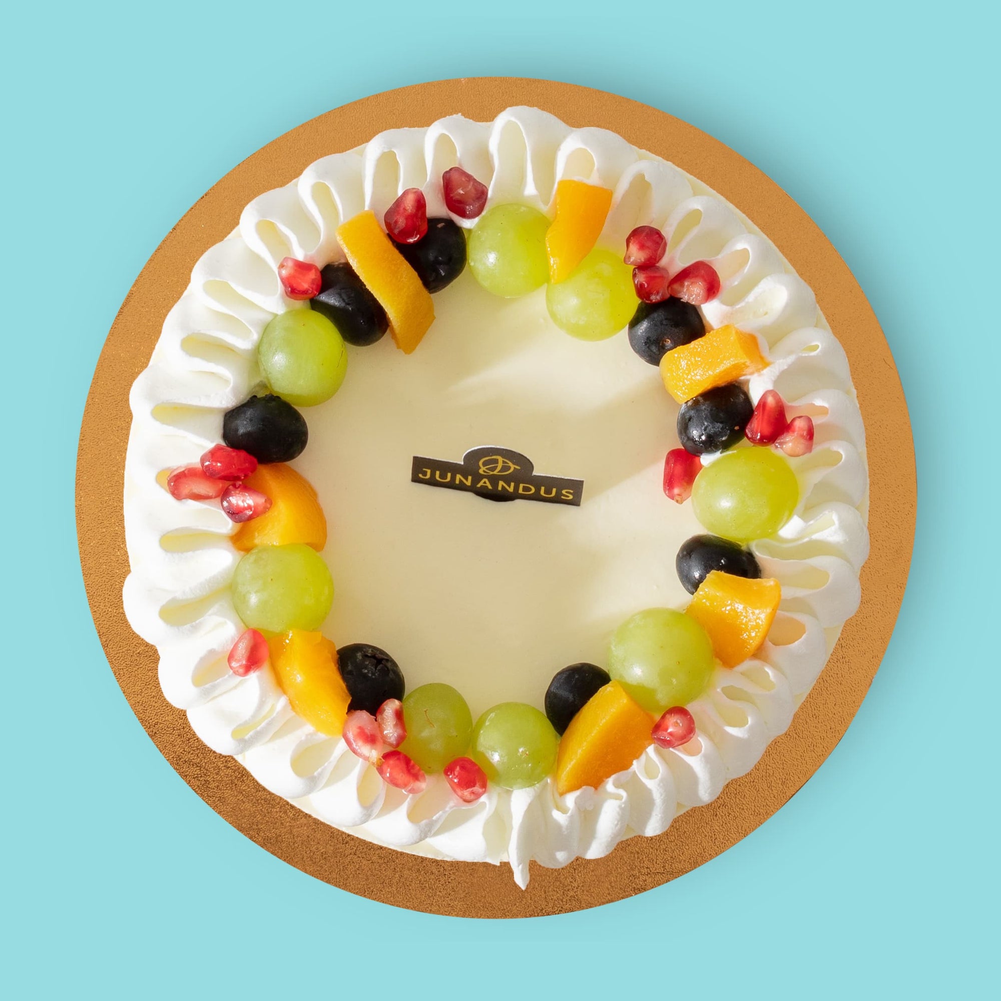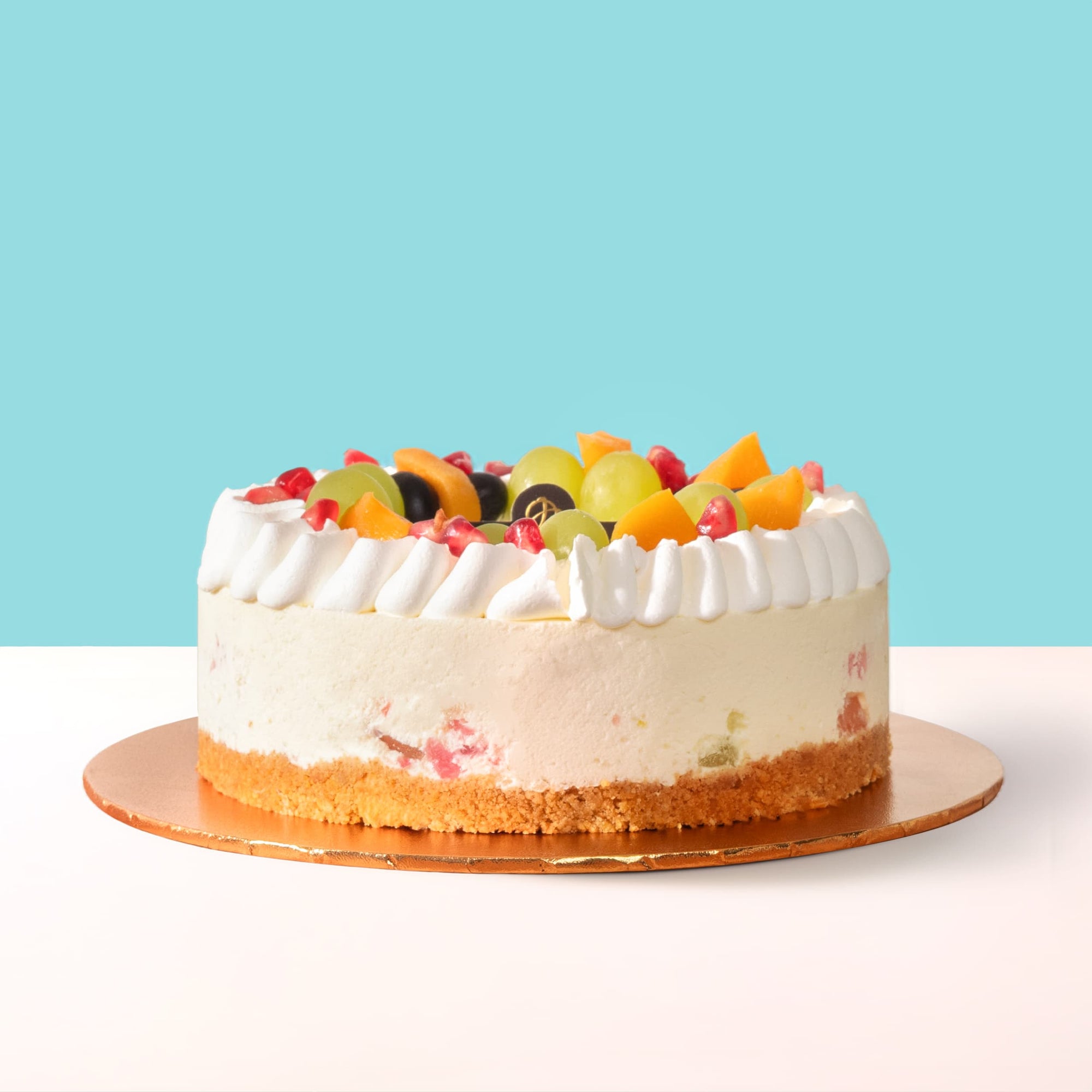A rainbow of fruity delight! Creamy Elle & Vire® soft cream cheese on a sugar-free digestive biscuit base, crowned with six dazzling jelly flavours—strawberry, orange, lemon, green apple, blue pea flower, and blackcurrant. Topped with season's finest mango, grapes, pomegranate, and berries. Send them this vibrant, guilt-free masterpiece that's light, refreshing, and bursting with colour!